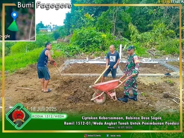 Ciptakan Kebersamaan, Babinsa Desa Sagea Ramil 1512-01/Weda Angkat Tanah Untuk Penimbunan Pondasi