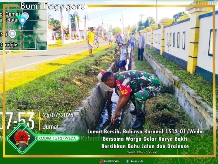 Halmahera Tengah-Babinsa Serda Jasmin Mahmud bersama warga masyarakat melaksanakan kegiatan Karbak, berupa pembersihan bahu jalan dan saluran air, bertempat di Desa Wairoro Indah Kecamatan Weda Selatan Kabupaten Halmahera Tengah.Jumat, (25/07/2025)