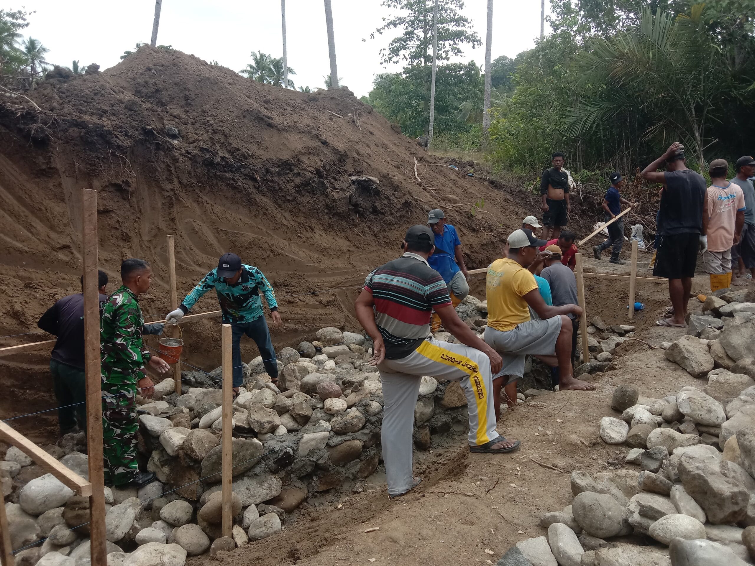 Personel Kodim 1505/Tidore bersama warga setempat terus mempercepat proses pembangunan jembatan yang telah lama diimpikan masyarakat tersebut. Saat ini, pengerjaan telah memasuki tahap penting, yakni pengecoran pondasi dasar sebagai penopang utama konstruksi jembatan.