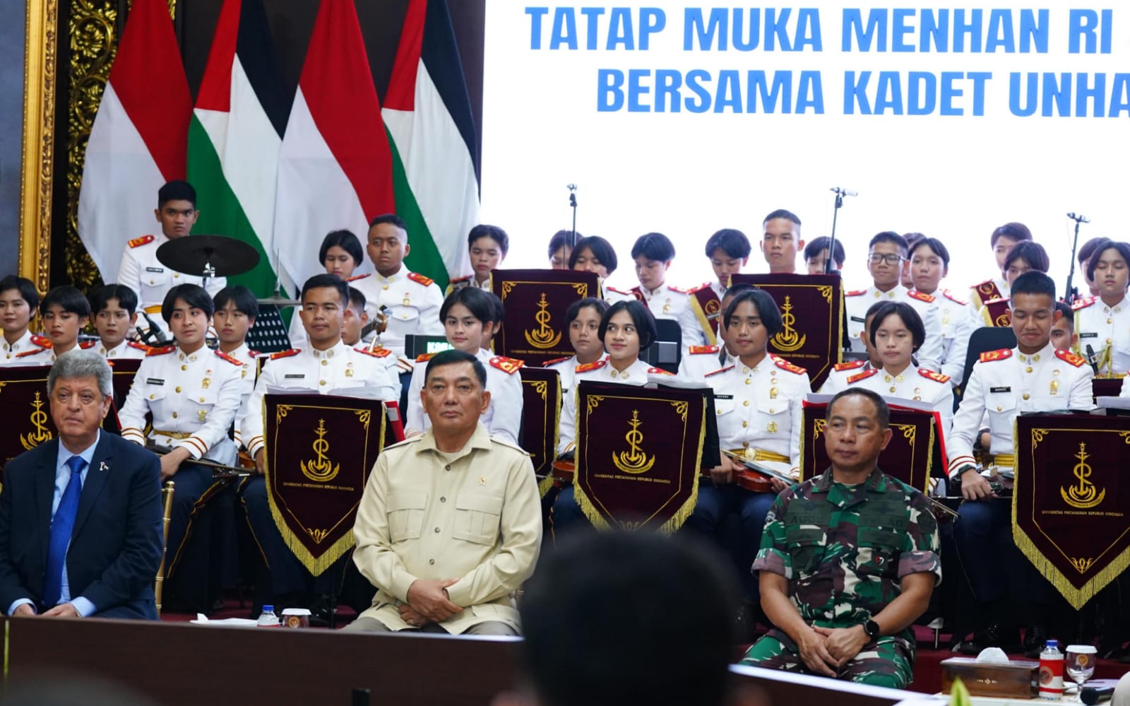 Jakarta – Panglima TNI Jenderal TNI Agus Subiyanto mendampingi Menteri Pertahanan RI Bapak Sjafrie Sjamsoeddin memberi pengarahan kepada 44 Kadet Universitas Pertahanan (Unhan) asal Palestina. Kegiatan berlangsung di Aula Bhineka Tunggal Ika, Gedung Sudirman, Kementerian Pertahanan RI, Jakarta Pusat, Jumat (26/9/2025).