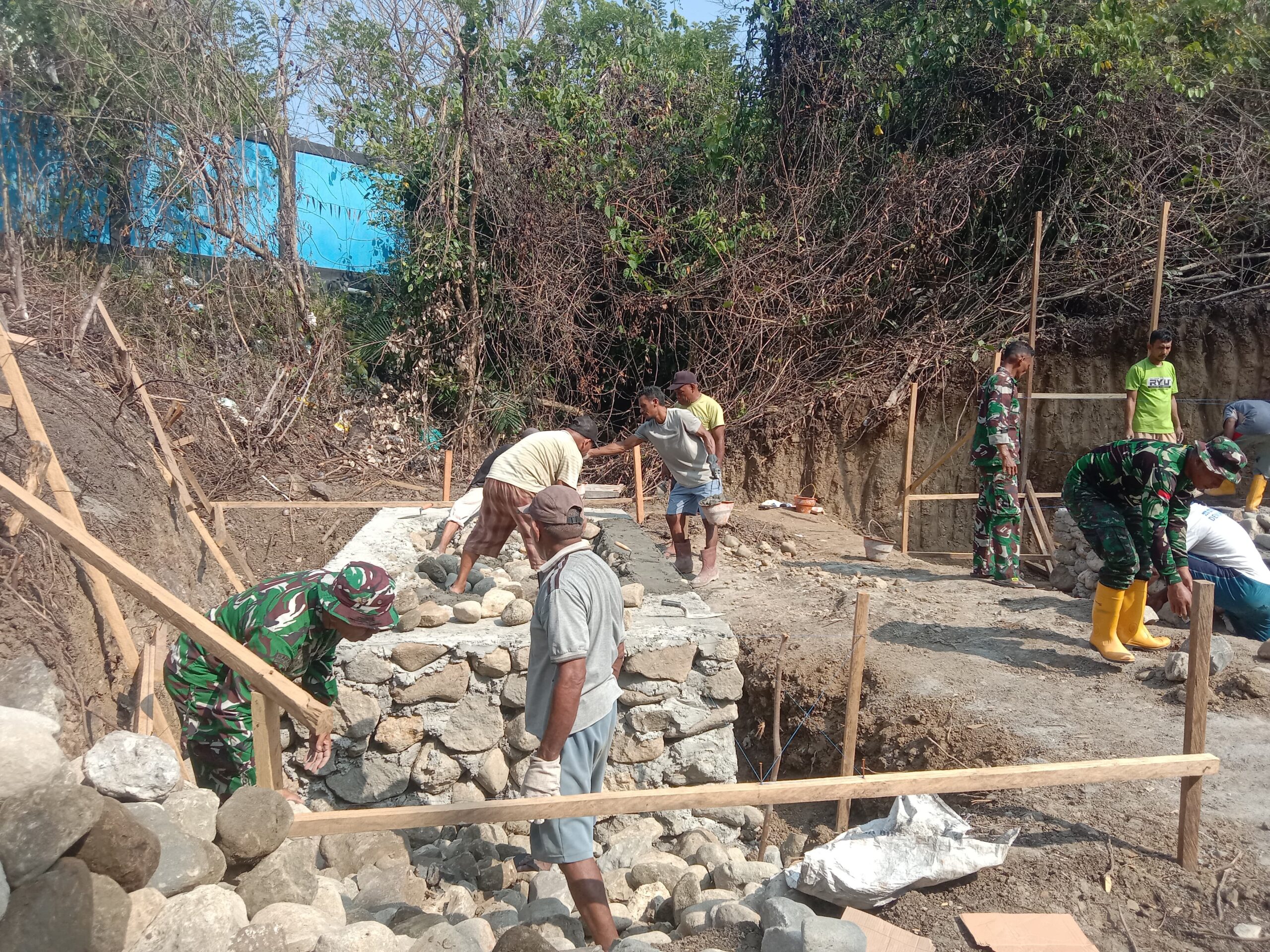 Dengan penuh semangat kebersamaan, anggota TNI dan warga tampak kompak melaksanakan pekerjaan di lokasi pembangunan. Mulai dari pekerjaan fisik hingga tahap lanjutan, semua dikerjakan secara gotong royong demi mempercepat penyelesaian jembatan yang sangat dinantikan masyarakat.