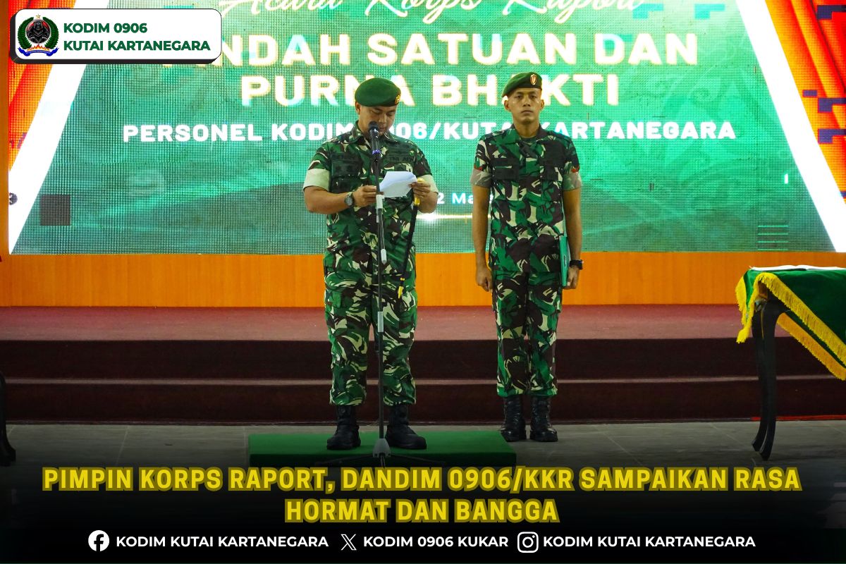Kutai Kartanegara, bmwnews– Sebagai bentuk penghargaan serta penghormatan kepada prajurit yang telah selesai melaksanakan tugas pengabdian di satuan, Komandan Kodim (Dandim) 0906/Kutai Kartanegara (Kkr), Letkol Arm. Benny Budiman, S.A.P , pimpin acara Korps Raport Pindah Satuan dan Purna Bakti personel Kodim 0906/Kkr yang digelar di aula Darmawangsa Makodim Jalan KH. Ahmad Mukhsin Kelurahan Timbau Kecamatan Tenggarong, Kukar. Senin (02/3/26)