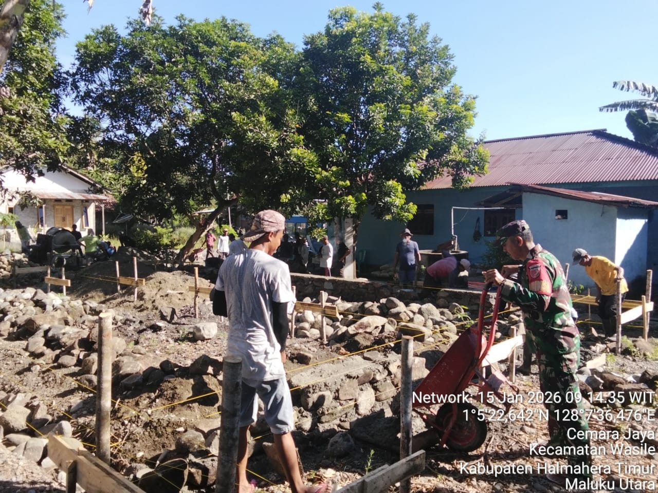 Halmahera Timur_Sebagai bentuk kepedulian terhadap warga binaan, Babinsa Koramil 1505-02/Wasile Kodim 1505/Tidore Pelda Hasibuan bersama masyarakat melaksanakan kegiatan gotong royong pembangunan pondasi rumah milik Bapak Widodo, warga Desa Cemara Jaya, Kecamatan Wasile, Kabupaten Halmahera Timur, Kamis(15/1/2026).