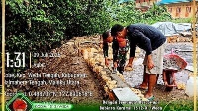 Halmahera Tengah-Babinsa Praka Wawan Awal bersama warga masyarakat melaksanakan giat Karbak, membantu pembangunan Pondasi rumah…