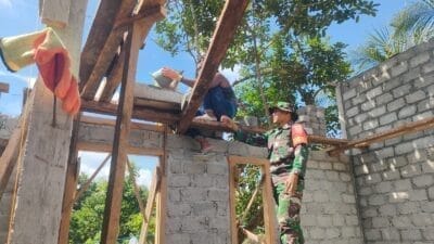 Babinsa Ikut Kencangkan Paku Bangun Rumah Warga