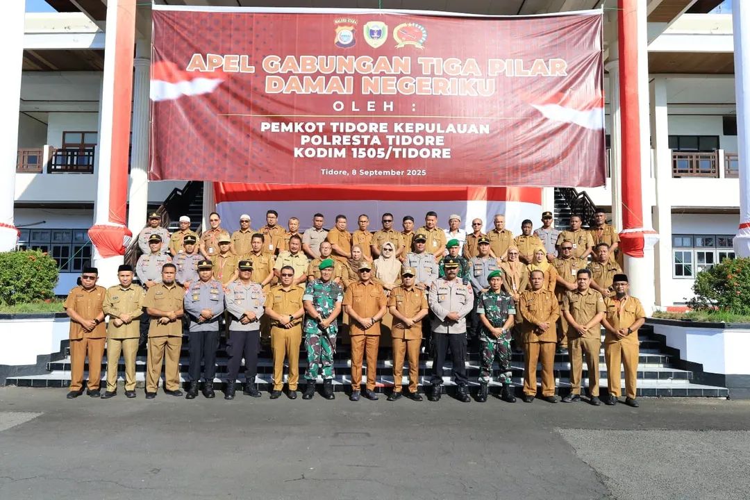 Tidore Kepulauan – Apel Gabungan Tiga Pilar dengan tema “Damai Negeriku” digelar di halaman Kantor Wali Kota Tidore Kepulauan, Senin (08/09/2025). Kegiatan ini menjadi bukti nyata sinergi antara TNI, Polri, dan Pemerintah Kota Tidore Kepulauan dalam menjaga keamanan serta ketertiban wilayah.